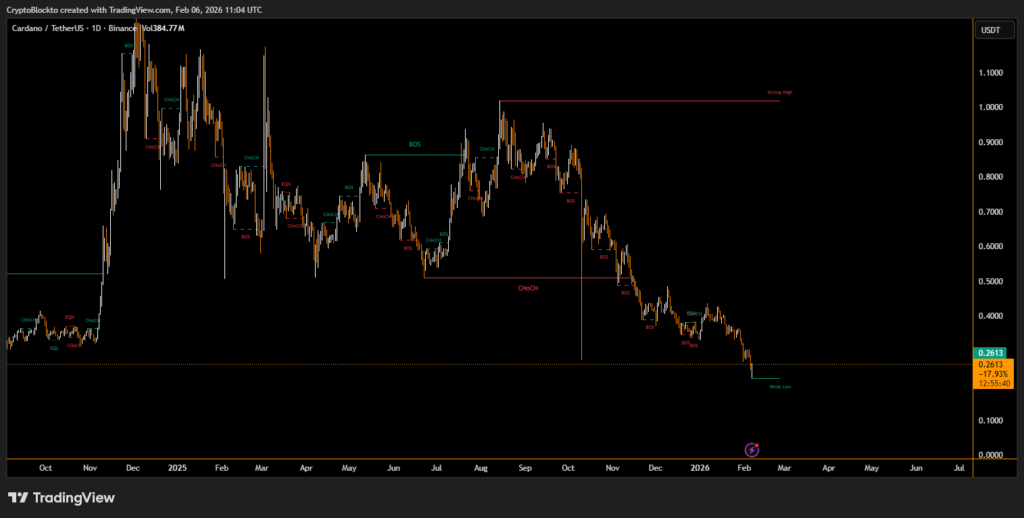 Cardano’s native token ADA fell more than 11% in 24 hours, trading near $0.25. The price is now down roughly 92% from its all-time high of $3.09 reached in September 2021. The broader crypto market also declined, with major assets posting double-digit losses amid weak sentiment and low liquidity.