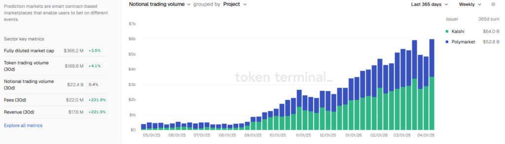 Prediction platforms such as Kalshi and Polymarket have experienced strong growth, with combined monthly trading volumes reaching approximately $23.6 billion in March, reflecting increasing market participation.