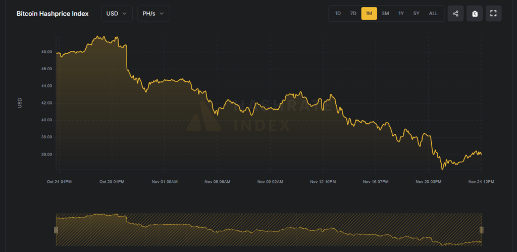 Hashprice fluctuates based on four factors: Bitcoin price, network difficulty, block rewards, and fee volume. With Bitcoin down over 30% since its October peak and network hashrate hovering just above one zettahash, miner profitability remains under pressure.