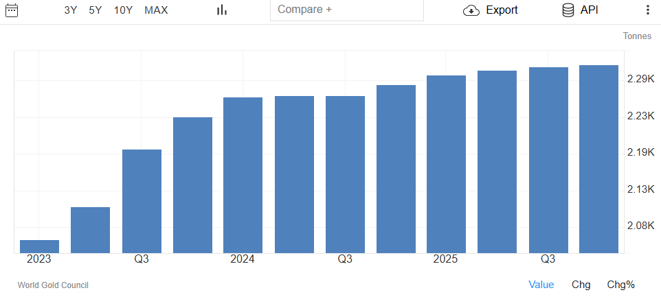 China’s gold reserves surged to an all-time high of 2,306.30 tonnes in the fourth quarter of 2025, up from 2,303.50 tonnes in the previous quarter. This marks the highest level of gold holdings in the country’s modern history.