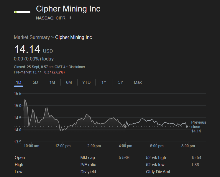 Following the announcement, Cipher’s stock price spiked by more than 22% in pre-market trading, before stabilizing near $14.95, giving the company a market cap of $5.6 billion. Shares have gained over 190% year-to-date, reflecting strong investor appetite for firms straddling both crypto and AI sectors.