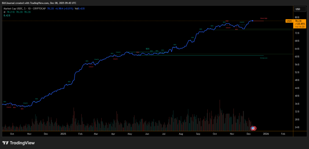The timing aligns with a period of rapid expansion for USDC. The stablecoin’s market capitalization has climbed 77% since the start of 2025, rising from $44 billion to $78 billion, marking one of the strongest growth phases in its history. This surge reflects Circle’s push into traditional finance through partnerships with major institutions including Mastercard and Deutsche Börse.