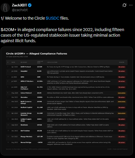 Blockchain investigator ZachXBT has criticized Circle’s approach, claiming delays have allowed more than $420 million in illicit funds to escape since 2022. He highlighted incidents affecting platforms such as Drift Protocol, where a suspected North Korea-linked exploit earlier this month resulted in losses of up to $280 million, including roughly $230 million in USDC transferred across multiple chains.