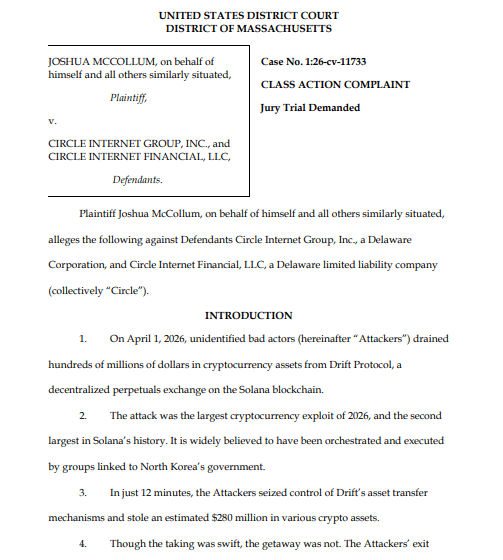 Stablecoin issuer Circle Internet Group is facing a class action lawsuit after the $280 million exploit of Drift Protocol on April 1, with investors alleging the company failed to act quickly to stop stolen funds from being moved. The lawsuit was filed in a U.S. district court in Massachusetts by Drift investor Joshua McCollum on behalf of more than 100 affected investors.