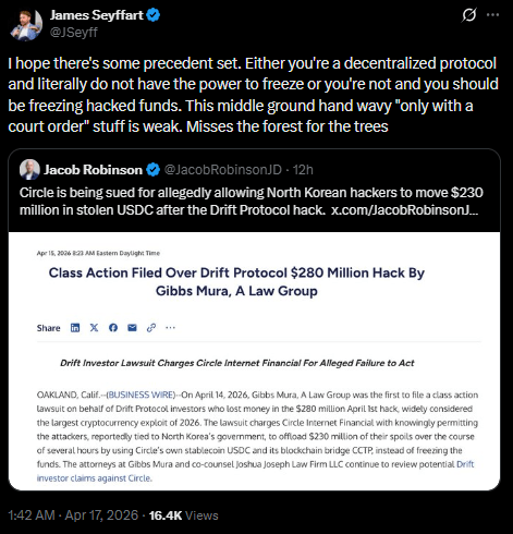The case highlights a growing legal grey area regarding whether crypto companies should intervene when exploits occur. Lawyers representing the investors noted that Circle froze 16 USDC wallets in connection with a sealed civil case roughly a week before the Drift incident, suggesting the company had the technical capability to act.