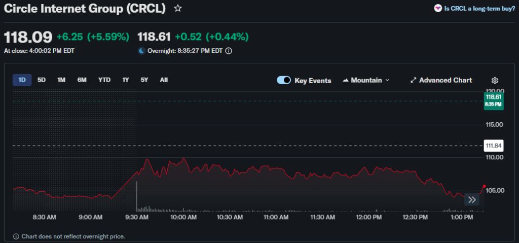 The stock has gained significant momentum in recent months. After falling to around $50 in early February, Circle shares have more than doubled, closing at $118.17 on Tuesday. The company’s market capitalization now stands near $30.3 billion, with the stock rising about 49% year to date. This performance has outpaced both the S&P 500 and the Nasdaq-100 over the same period.