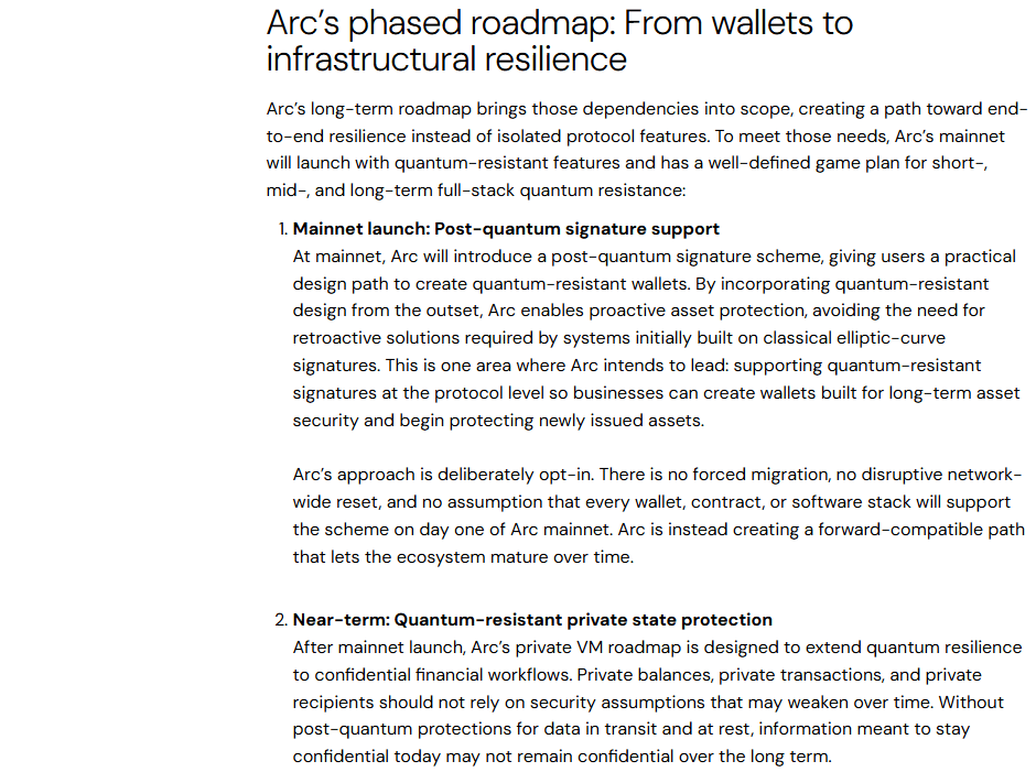 A key feature of the plan includes introducing post quantum signature mechanisms on the Arc mainnet using an opt-in model, allowing users and developers to upgrade without forcing immediate migration. This approach is designed to maintain system stability while gradually improving network security.