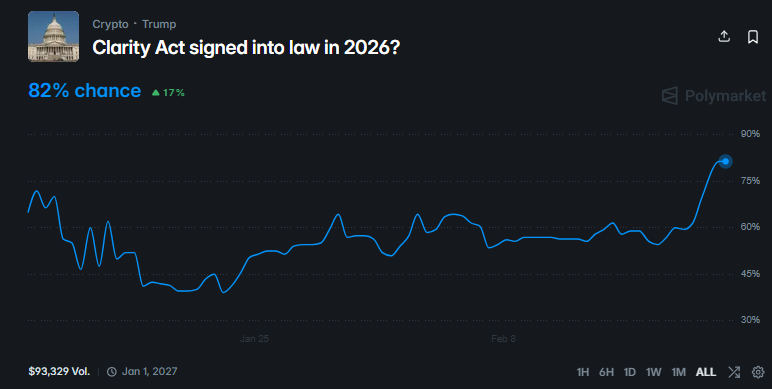 Prediction markets reflect growing optimism. On Polymarket, bettors currently assign an 82% probability that the bill will pass before year-end.