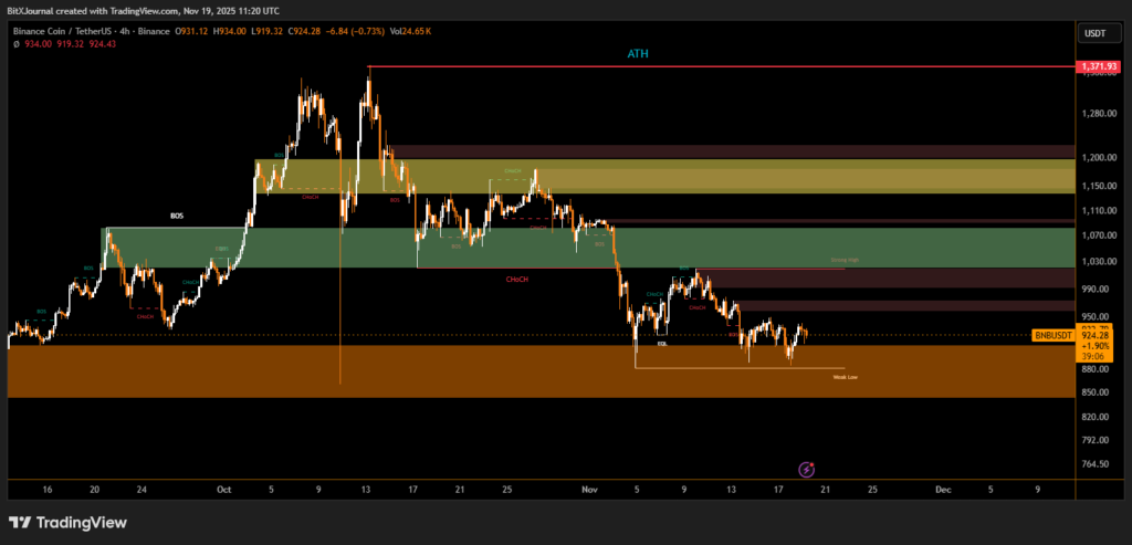 “BNB’s pattern is showing a clean sequence of lower highs and repeated CHoCH events. This tells us buyers are not defending key zones the way they did during September and early October,” said BitXJournal market technician tracking large-cap assets.