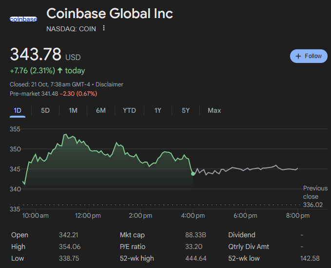 Following the acquisition news, Coinbase stock (COIN) closed up 2.31% at $343.78 on Monday and is up 33% year-to-date, according to The Block’s market data. The exchange currently boasts a market capitalization of $88.3 billion.
