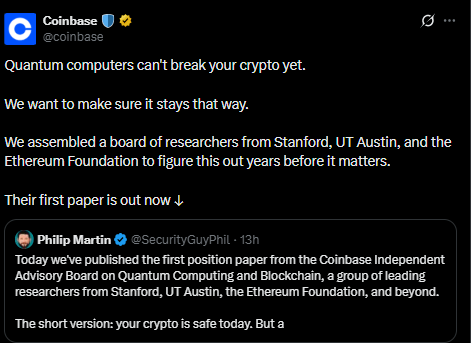 Coinbase has spotlighted growing efforts by blockchain networks to prepare for future risks posed by quantum computing, warning that while the threat is not immediate, it is ultimately unavoidable. Its Independent Advisory Board on Quantum Computing and Blockchain stated that a sufficiently advanced quantum machine could eventually break the cryptographic systems securing digital assets. However, such technology is likely at least a decade away, as it would require capabilities far beyond today’s most powerful supercomputers.