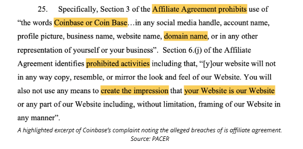 “Honscha violated the affiliate agreement by incorporating the COINBASE trademark directly in the domain name,” Coinbase claimed.