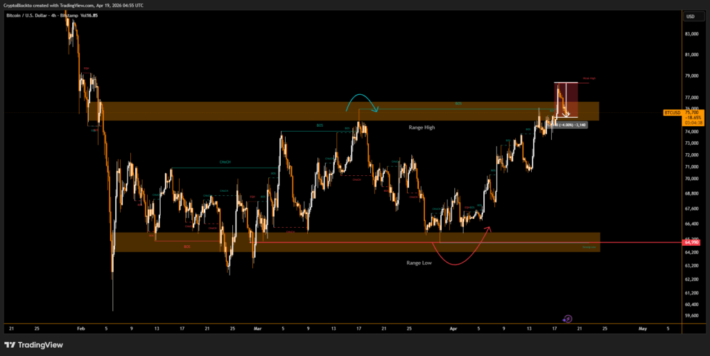 Bitcoin briefly climbed to around $78,000 on Friday following positive news related to easing geopolitical tensions and declining oil prices. However, the rally lost momentum, with Bitcoin laterat the time of writting trading near the $75,800 to $76,000 range as market sentiment stabilized.