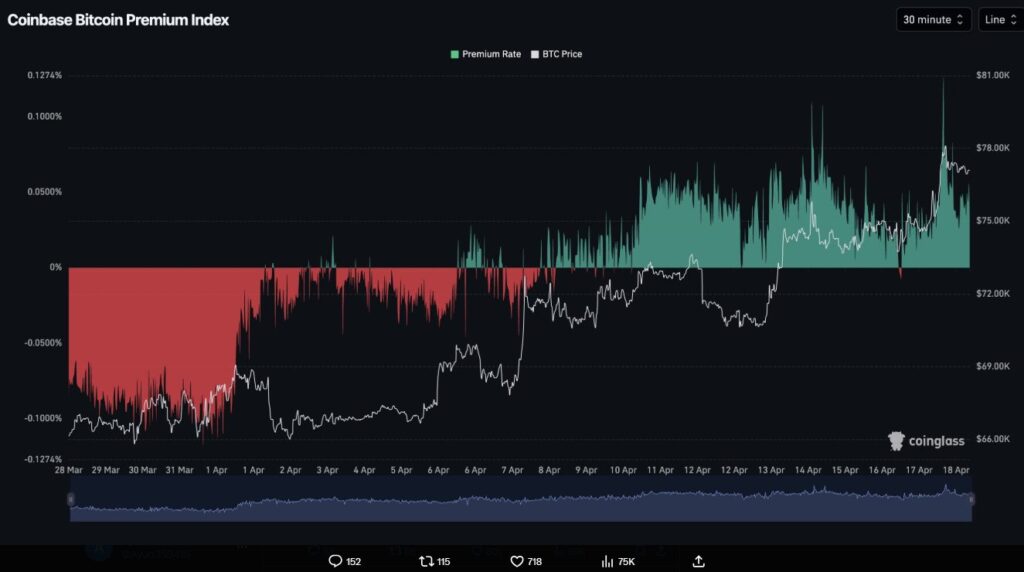 Bitcoin showed renewed strength after the Coinbase Premium index surged to its highest level in seven months, reaching the equivalent of $81,000 per BTC at its peak. The premium reflects the difference between Bitcoin prices on Coinbase and those on global exchanges, and a widening gap typically signals strong demand from United States-based investors, particularly large institutions.