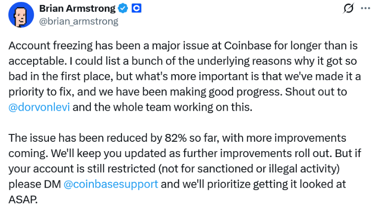 In a public statement on June 6, Armstrong acknowledged the account freezing issue had persisted “longer than acceptable.” He emphasized that resolving the issue is now a top operational priority, adding that affected users should contact Coinbase Support directly for assistance.