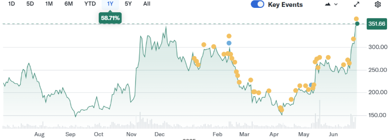 Coinbase Global (COIN) is closing in on its record closing high of $357.39, set in November 2021, after surging to a 52-week intraday peak of $369.25 on Wednesday. The rally reflects renewed investor confidence in the U.S. crypto sector, driven by rising Bitcoin prices, pro-crypto policy momentum, and robust revenue growth.