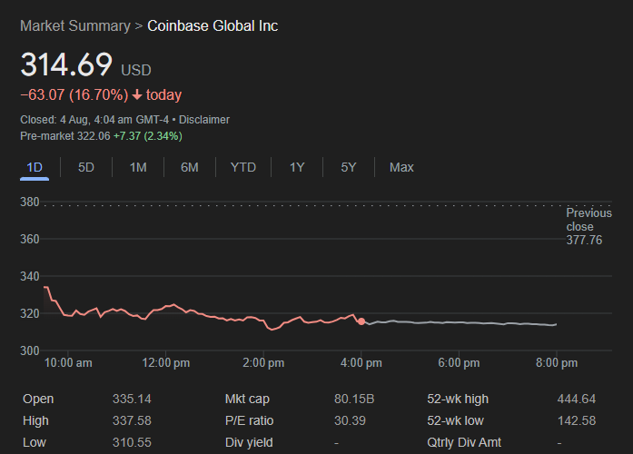 Shares of Coinbase (COIN) closed last week with a sharp 19.6% loss, marking the exchange’s worst weekly performance since September 2024. The drop follows disappointing second-quarter earnings and growing concerns among investors about valuation versus fundamentals.