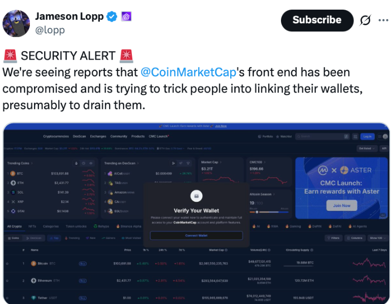 CoinMarketCap has confirmed the removal of a malicious popup that appeared on its website prompting users to “Verify Wallet,” a tactic often used in crypto phishing scams. In a post on its official X account, the platform stated, “We’ve identified and removed the malicious code from our site,” while adding that a full security investigation remains ongoing.