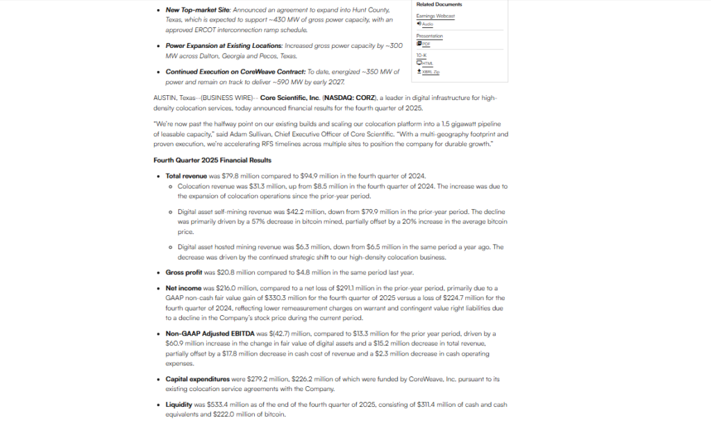 Crypto mining revenue dropped sharply to $42.2 million, nearly half of what the company recorded in the comparable quarter of the previous year. Despite the revenue miss, Core Scientific posted net income of $216 million, largely driven by a $330.3 million fair value gain tied to non cash holdings. However, adjusted EBITDA reflected a loss of $42.7 million.