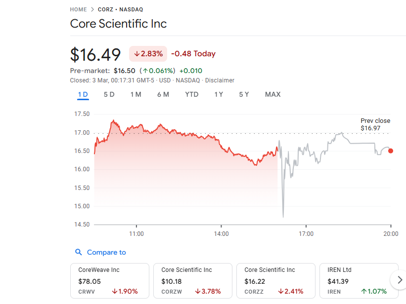 Shares in Core Scientific ended slightly lower on Monday after its Q4 earnings miss