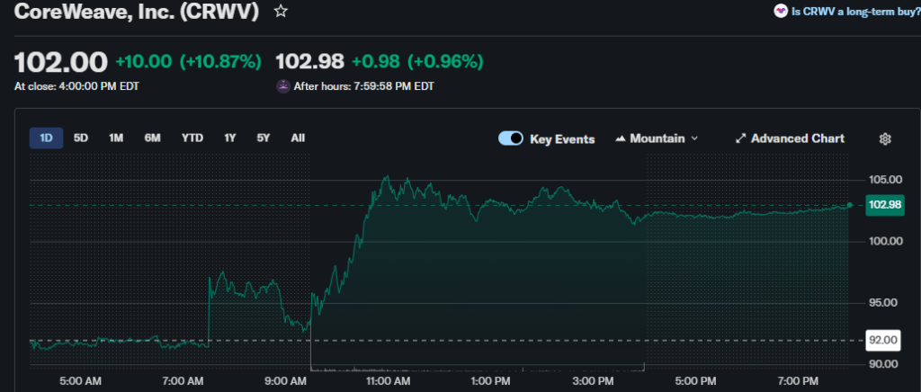 Following the announcement, CoreWeave shares jumped more than 12%, trading near $102.73. The deal also strengthens the company’s role in supporting major AI developers, as it reported serving nine of the ten largest builders of large language models.