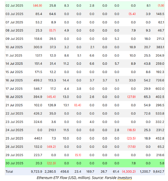 ETH buying is being driven not just by corporations like Metaplanet, Strategy, and SharpLink, but also by the growing influence of spot ETH ETFs, which have seen 19 consecutive days of net inflows—a record streak. According to Farside Investors, these ETFs have accumulated over $5.3 billion in ETH since July 3.