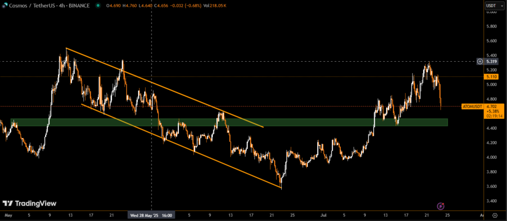Cosmos Hub’s native token, ATOM, witnessed a sharp decline of over 5% in the past 24 hours, as distribution pressure and market-wide weakness swept through the altcoin space. The token dropped from $5.08 to $4.82, briefly touching $4.78 before a modest recovery.