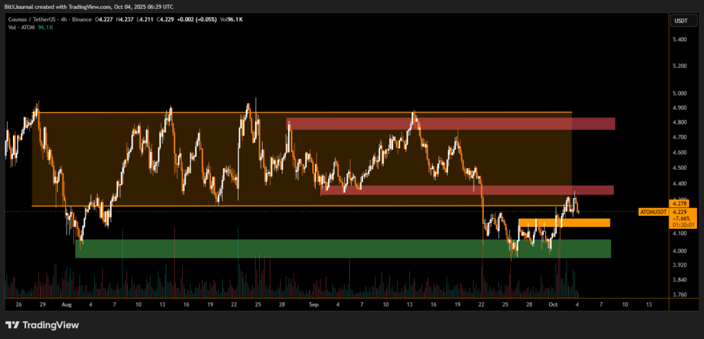 Over the last week, ATOM rebounded from the $4.00 green support area, rallying sharply before losing momentum near its established resistance zone. This pattern has kept the token largely range-bound between $4.00 and $4.90, frustrating traders awaiting a decisive breakout.