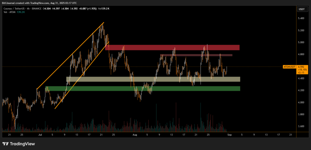 According to the latest 4-hour chart, ATOM has successfully defended the $4.40 demand zone, where buyers stepped in to halt a string of pullbacks. The green support level has been tested multiple times this month, each time triggering a recovery bounce.