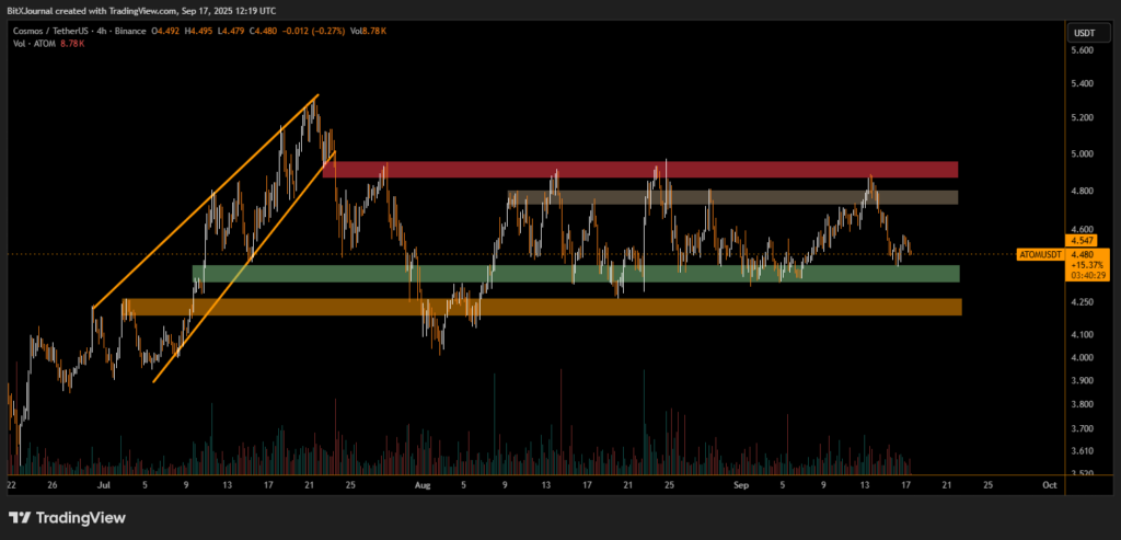 The 4-hour chart highlights a strong rally in July, where ATOM surged from below $4.00 toward $5.50, supported by an ascending channel. However, after failing to sustain momentum above $5.00, the price entered into a sideways phase. Since then, ATOM has tested both resistance and support zones multiple times without a clear breakout.