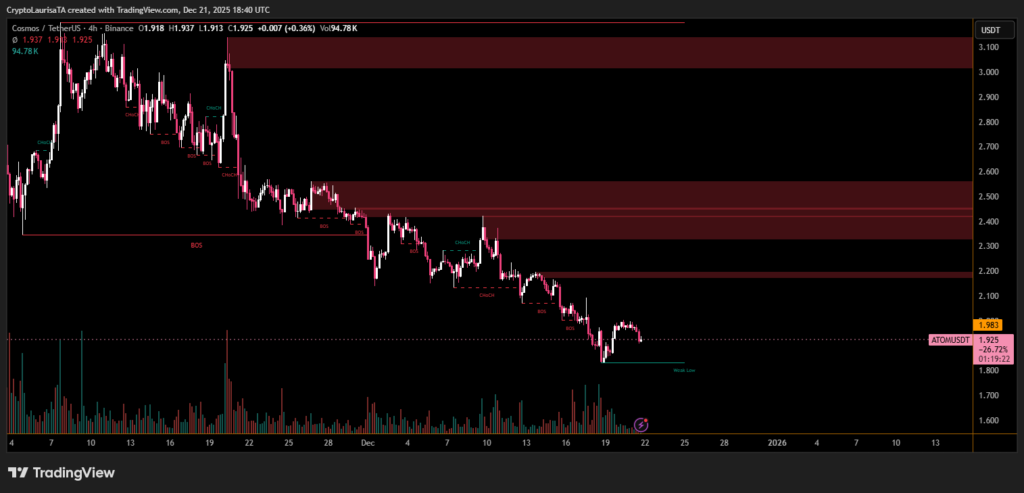 For Cosmos to improve its near-term outlook, price must decisively reclaim and hold above $2.00. Until that occurs, the broader trend remains biased to the downside, with consolidation near lows offering only tentative stability.