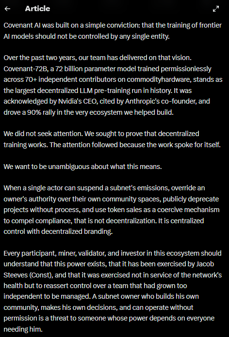 In a public statement on X, Covenant AI founder Sam Dare said the departure stems from governance conflicts with Bittensor co-founder Jacob Steeves, also known as “Const.” Dare argued that the network’s decentralization promise is misleading, calling it “decentralization theatre” and claiming that no single entity was supposed to control the system.
