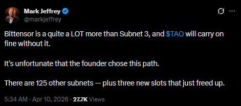 Dare further alleged that Steeves maintains effective authority through a “triumvirate structure” managing multisig upgrades. According to Covenant, actions taken against its subnets included suspension of emissions, removal of moderation privileges, and deprecation of subnet infrastructure. The founder also accused Steeves of applying economic pressure through token sales during periods of operational conflict.