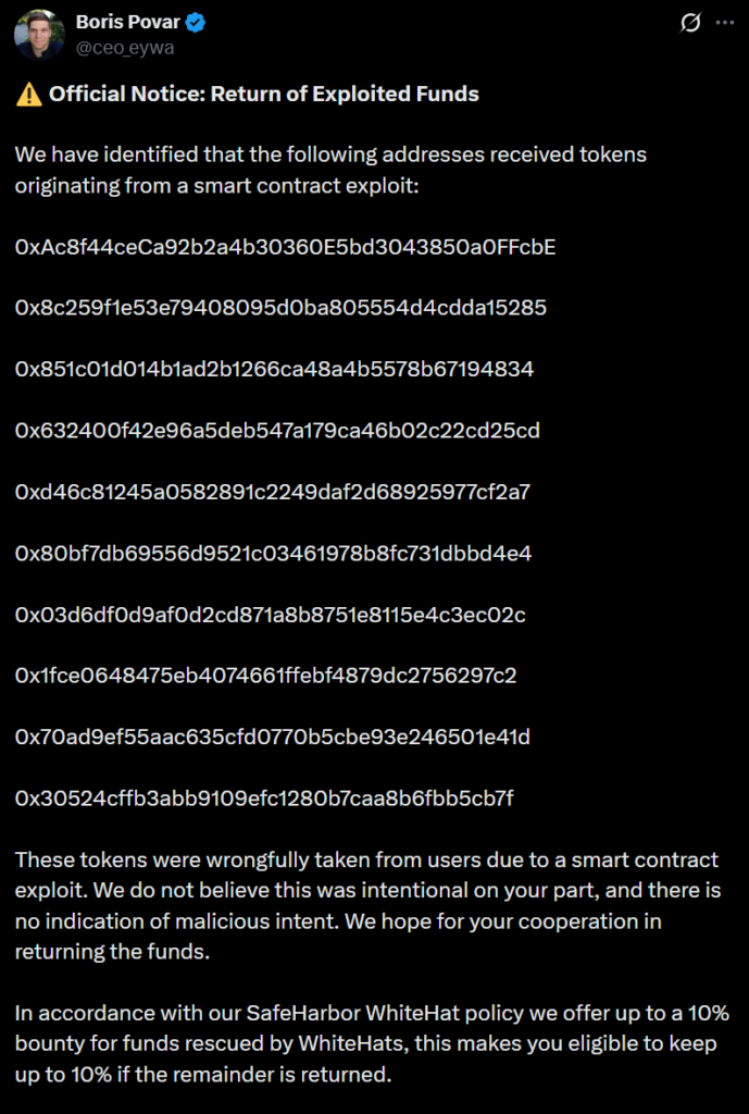 In response to the attack, CrossCurve’s leadership publicly shared wallet addresses linked to the exploit and offered a bounty of up to 10% for the return of funds within 72 hours. The team stated that failure to cooperate could result in legal action, including coordination with law enforcement and asset-freezing efforts.