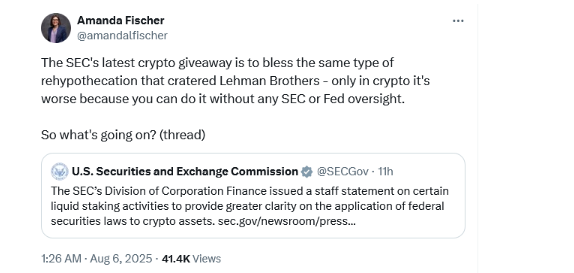 She took to X (formerly Twitter), warning that the SEC had just “blessed the same type of rehypothecation that cratered Lehman Brothers”, adding that in crypto it’s even riskier due to lack of oversight.