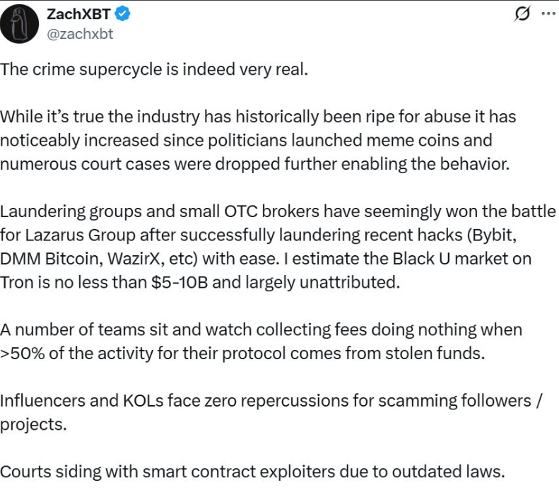 ZachXBT posted Thursday on X, highlighting that while crypto has always had its share of fraud, the rate of abuse has sharply increased since political figures began promoting memecoins and high-profile legal actions were dismissed.