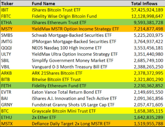 Another standout is the YieldMax MSTR Option Income Strategy ETF (MSTY), which drew $7.2 billion. While not directly holding crypto, it tracks a company known for significant Bitcoin treasury reserves.