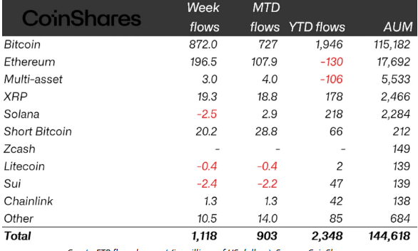 Crypto exchange traded products (ETPs) recorded $1.1 billion in inflows last week, marking the second-largest weekly gain of 2026 and the strongest inflow performance since January. Bitcoin (BTC) led the surge with $871 million in inflows, reinforcing its position as the dominant institutional asset within regulated crypto investment vehicles.