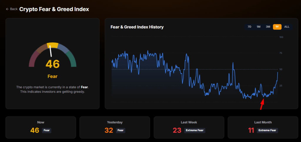 The Crypto Fear & Greed Index rose 14 points to 46 out of 100, marking its highest reading since Jan. 18 and its largest single day gain in over three months. Despite the improvement, the index remains in the “Fear” zone, where it has stayed since mid January.