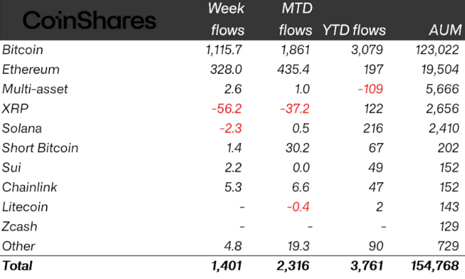 Meanwhile, Ethereum investment products added $328 million, marking their strongest week since January and turning year-to-date flows positive at $197 million.