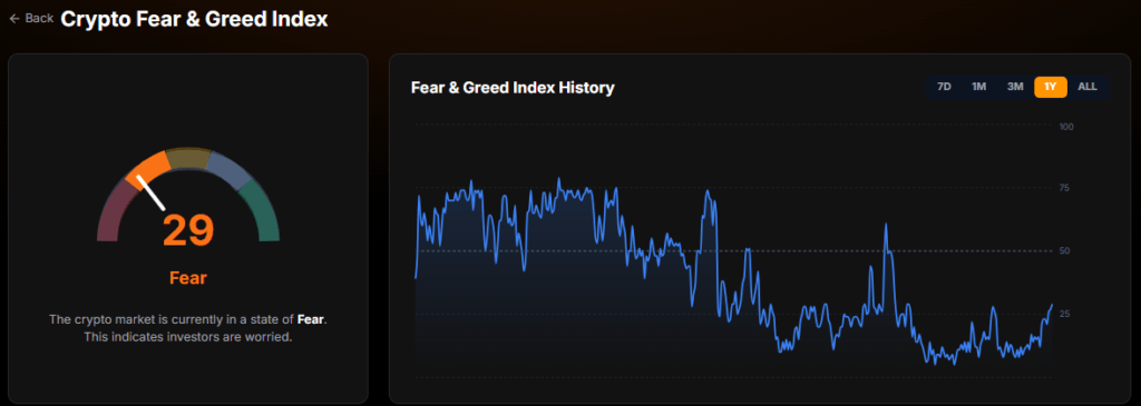 Sentiment improvement was also reflected in the Crypto Fear & Greed Index, which moved from “extreme fear” to “fear,” with the score rising above 29 .