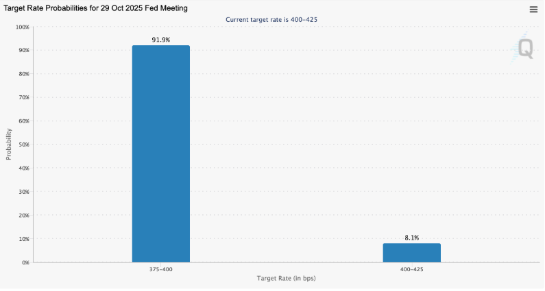 Market expectations point to further cuts of up to 50 basis points at the next FOMC meeting in October, with over 91% of traders pricing in easing, according to CME Group data. This shift aligns with the broader belief that lower rates make risk assets, including crypto, more attractive.