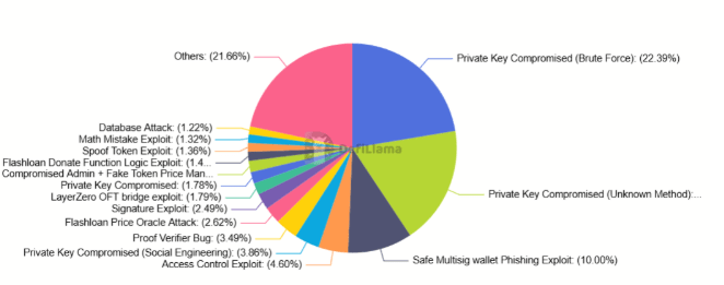Among the identified attack methods, 22.3% of incidents were linked to private key breaches using brute-force techniques, while 18.2% were tied to unknown compromise methods. Additionally, 10% of attacks were connected to phishing campaigns targeting multi-signature wallets, reinforcing concerns about vulnerabilities in wallet security and credential management systems.