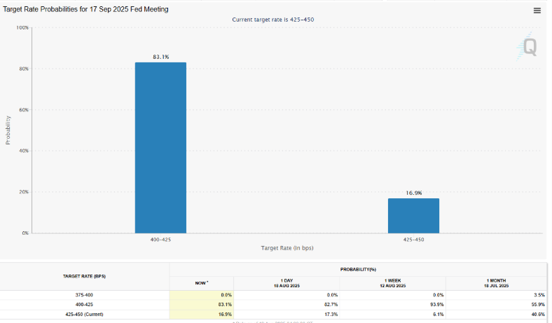 Markets currently price in an 83% chance the Fed holds rates steady at the September 17 FOMC meeting, according to CME Group’s FedWatch tool.