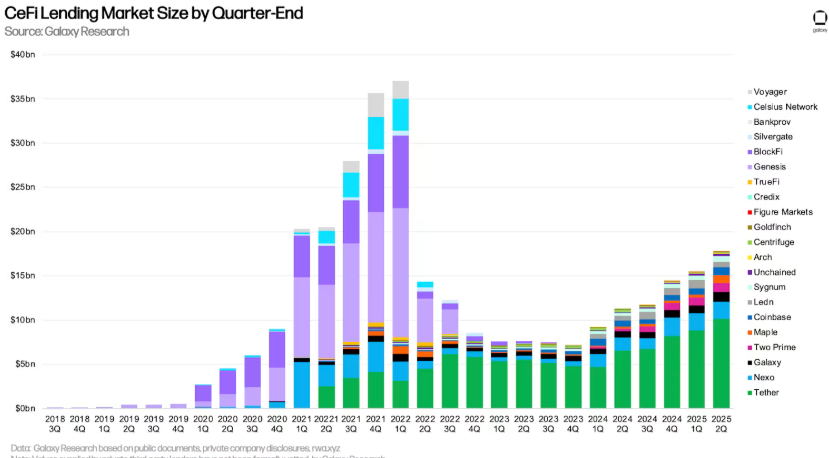 CeFi loans, thought to be in decline after the 2022 downturn, have bounced back impressively. Galaxy Research reports $17.78 billion in CeFi loans as of June 30, 2025, marking a 14.66% increase in just one quarter. When including $12.74 billion from DATCO debt and an additional $3–$6 billion from crypto ETF-backed loans, the total surpasses the $34.8 billion record set in 2021.