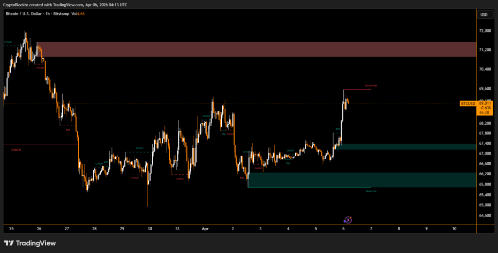 Bitcoin briefly climbed to $69,500 , reflecting improved sentiment following remarks by Donald Trump. Trump warned that Iran would face severe consequences if the Strait of Hormuz remained closed but also stated that negotiations were underway with a “good chance” of reaching a deal within 24 hours.