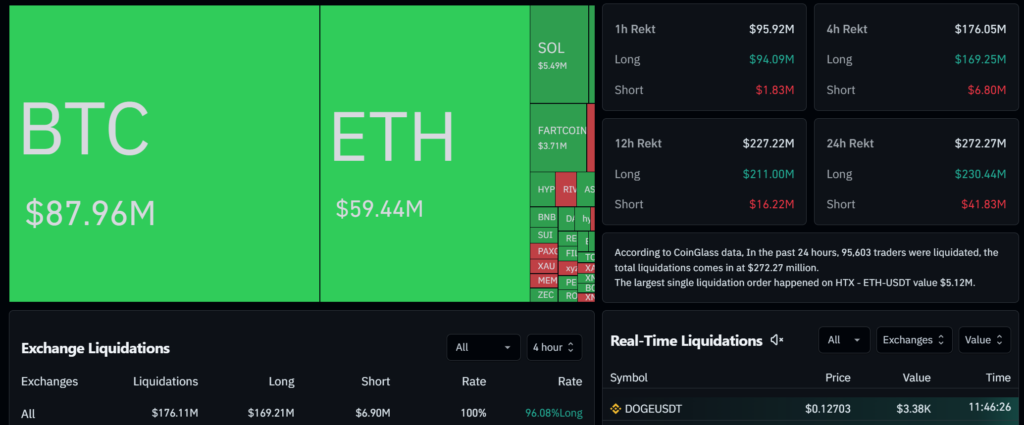 The crypto market experienced significant volatility in the past four hours, with $176 million worth of positions liquidated across the network, according to the latest data from Coinglass. The bulk of these liquidations came from long positions, highlighting ongoing market pressure on bullish traders.