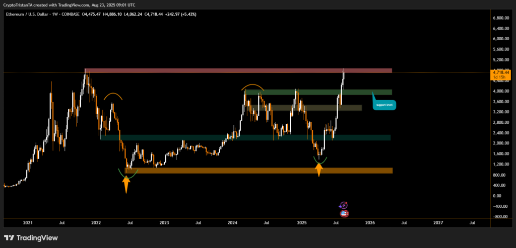 The crypto market responded immediately, with Bitcoin jumping 5% to $117,300, triggering the liquidation of $379.88 million in short positions. Meanwhile, Ether soared 11.5%, reclaiming its 2021 all-time high of $4,878, briefly touching $4,851, according to CoinMarketCap.