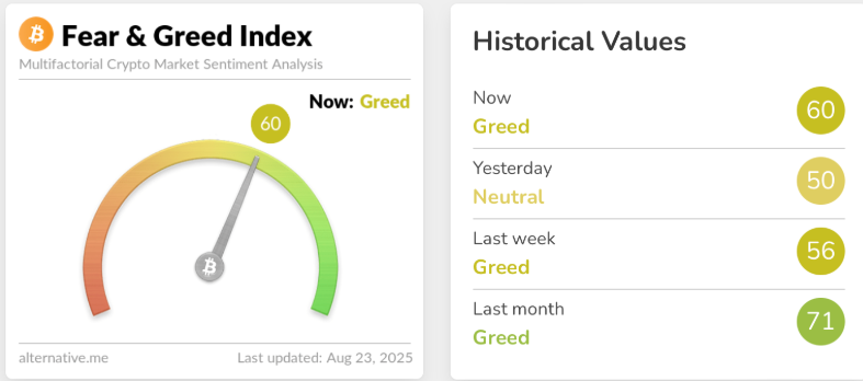 According to the Crypto Fear & Greed Index, the sentiment score climbed to 60 (Greed) on Saturday, a significant rise from Friday’s neutral reading of 50, and a sharp recovery from earlier in the week when it dipped into “Fear.” This surge in optimism followed Powell’s remarks at the Jackson Hole economic symposium, where he acknowledged that current inflation and labor market conditions “may warrant adjusting” the Fed’s monetary stance.