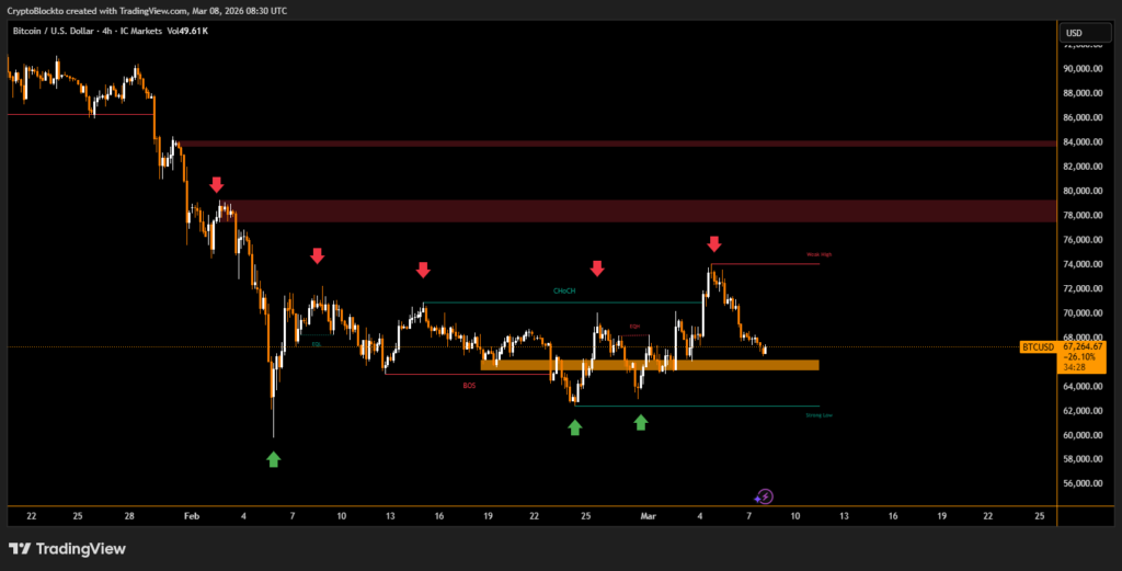 The crypto market experienced strong volatility this week, driven by geopolitical tensions and shifting institutional flows. BTC began the week near $63,000 before rebounding sharply and briefly touching around $74,000 during mid week trading. By the end of the week, BTC pulled back toward the $67,000–$70,000 range after profit taking and renewed macro uncertainty.
